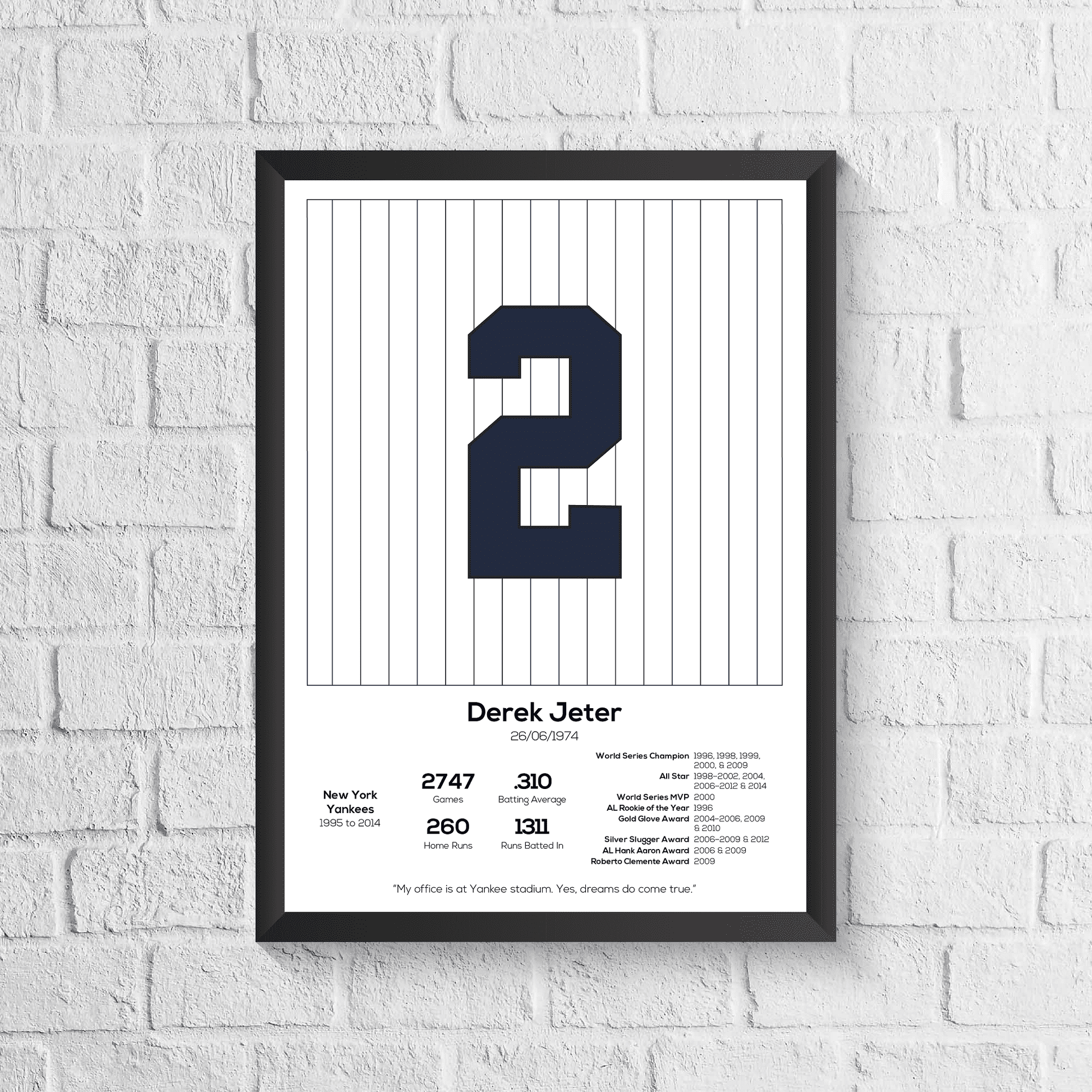 Introducing our exclusive Derek Jeter New York Yankees Career Stats Print – a timeless tribute to one of the greatest ever Yankees players and his legendary baseball career. Whether you're a die-hard Yankees fan or just a lover of sports legends, this print is sure to make a statement on your wall. Immerse yourself in the glory days of Derek Jeter's illustrious career with detailed and accurate statistics showcasing his incredible achievements on the field. The print is made using glossy paper, ensuring that it will last a lifetime without fading or yellowing. It's available in a range of sizes to suit any space, from a small bedroom to a large living room, man cave, sports bar, office room and more. Plus, it comes framed or unframed, giving you the flexibility to choose a size that complements your space. This high quality print is a must-have for any baseball enthusiast, Yankees fan, or sports memorabilia collector.