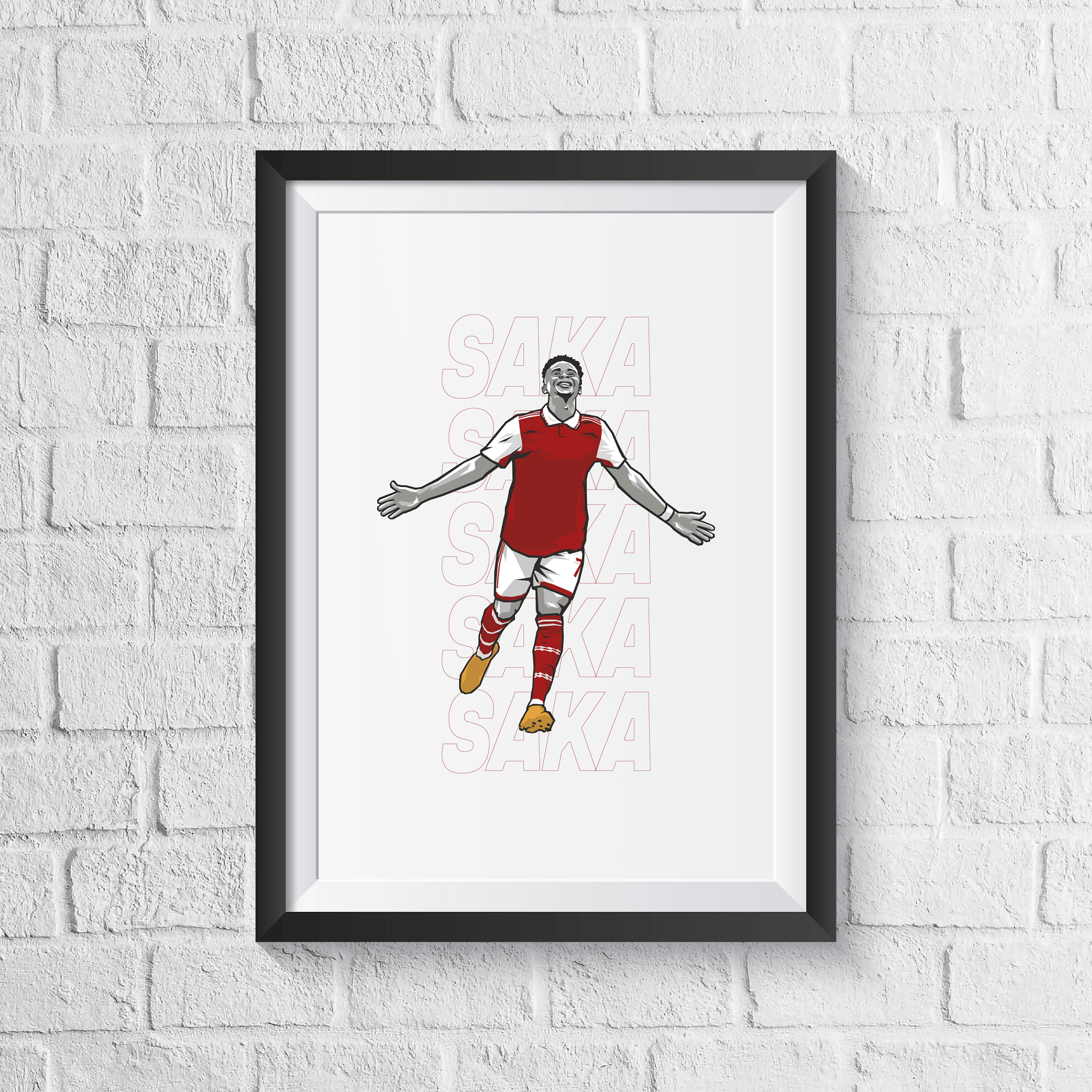 Print of fans favourite, Bukayo Saka. Saka has been with the club since he was 7 and has established himself as a hero with the Emirates faithful after a series of amazing attacking displays. The perfect gift for any Gooners fan.