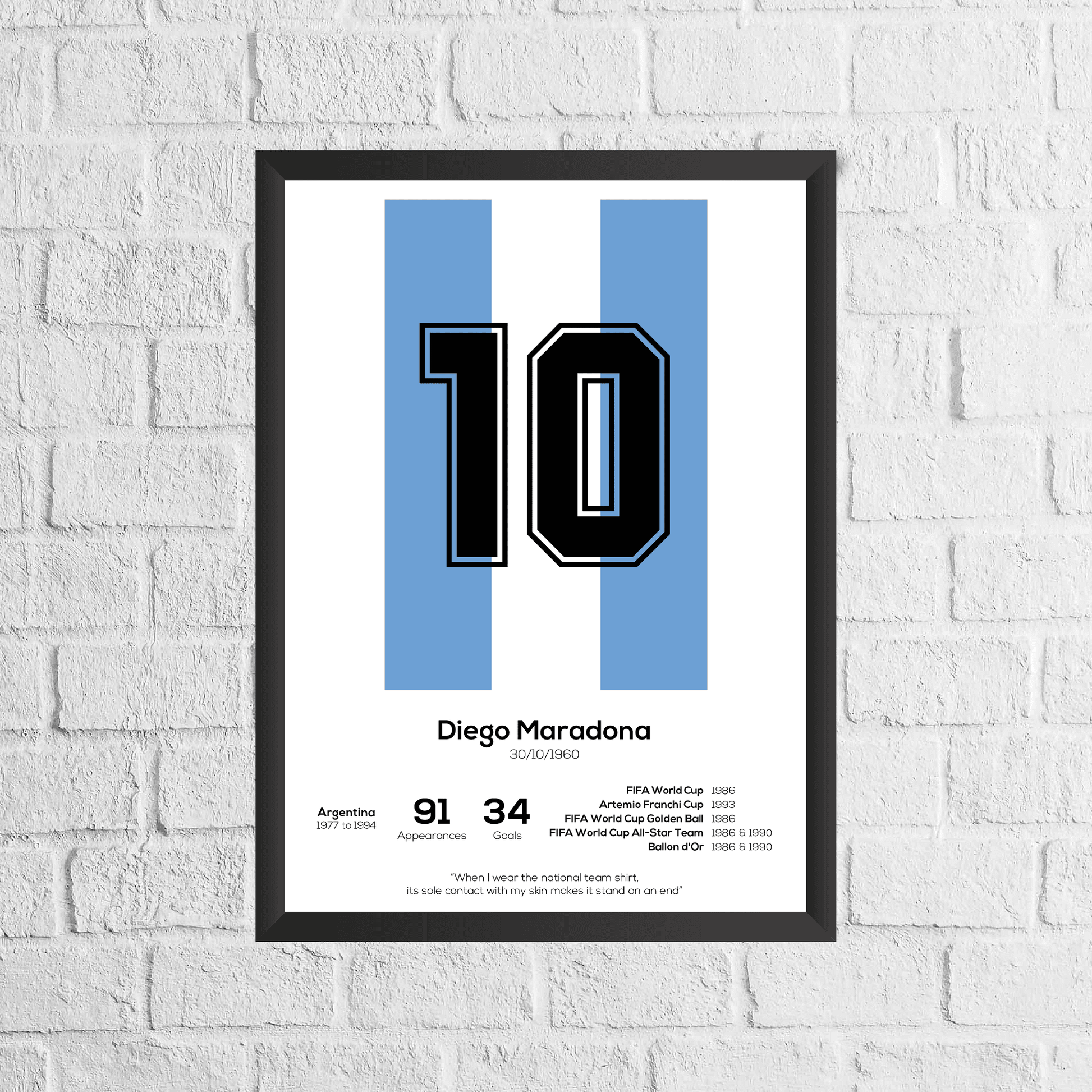 Diego Maradona Argentina career stats print. Celebrate a true legend of the game and Argentinian footballing God, Diego Armando Maradona. Widely regarded as one of the best players the game has ever seen, Maradona captained his country to World Cup glory in 1986 with a string of amazing solo performances. The perfect gift for any Maradona and Argentina fan.