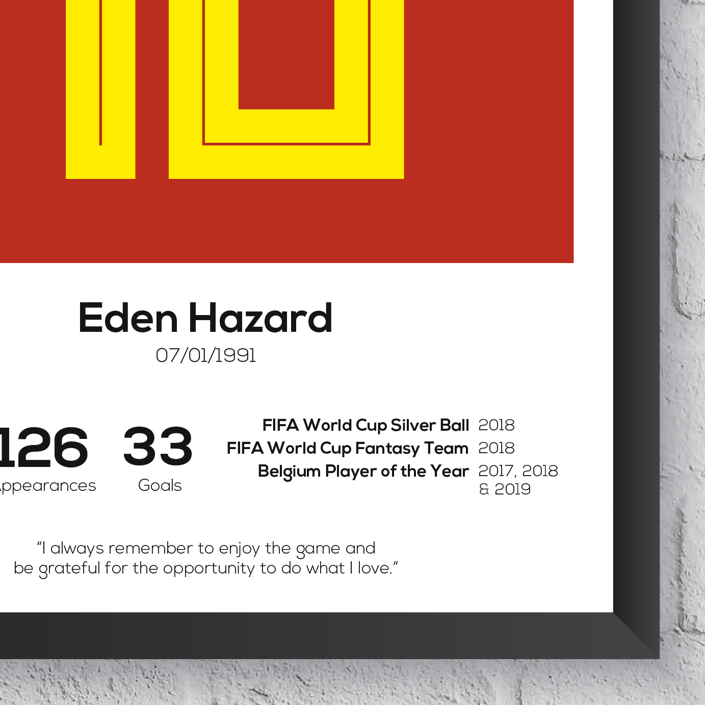 Eden Hazard Belgium career print. Remember the amazing international career of Belgian legend, playmaker and number 10, Eden Hazard. Hazard for his country during their 'golden era' amongst their most talented crop of players in history. This print is inspired by the famous red home shirt.