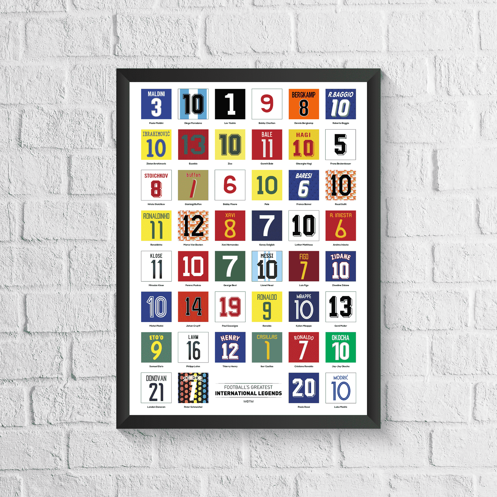 Legends of International Football Print. This poster celebrates 46 of the most iconic players to ever play the beautiful game. Featuring the shirts of legends such as Pele, Maradona, Messi and Ronaldo and many more, this is the perfect piece of football wall art for fans of all ages. Each one will bring back memories of a special goal, tournament, moment or match from the greatest football players of all time. This high quality print is the perfect gift for any football fan, perfect for any man cave wall, to decorate a sports bar or décor for a contemporary office.