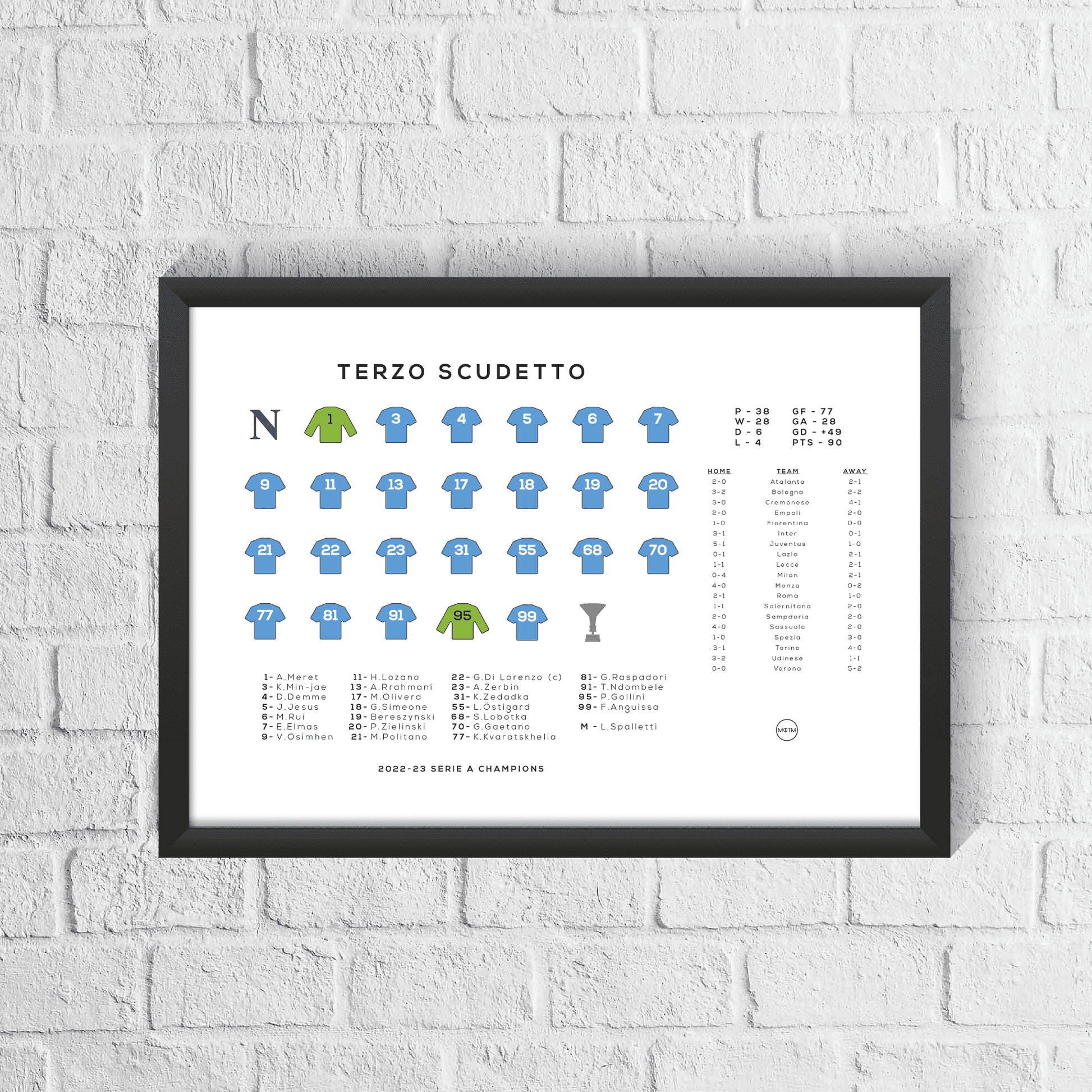 Introducing the Napoli 2022/23 Serie A season squad and results print. Relive the excitement of Napoli's thrilling 2022/23 season with our Napoli Season Print. Immerse yourself in the captivating moments and unforgettable triumphs of the team as they conquered the Serie A. This print is a must-have for every dedicated Napoli supporter and football enthusiast alike.