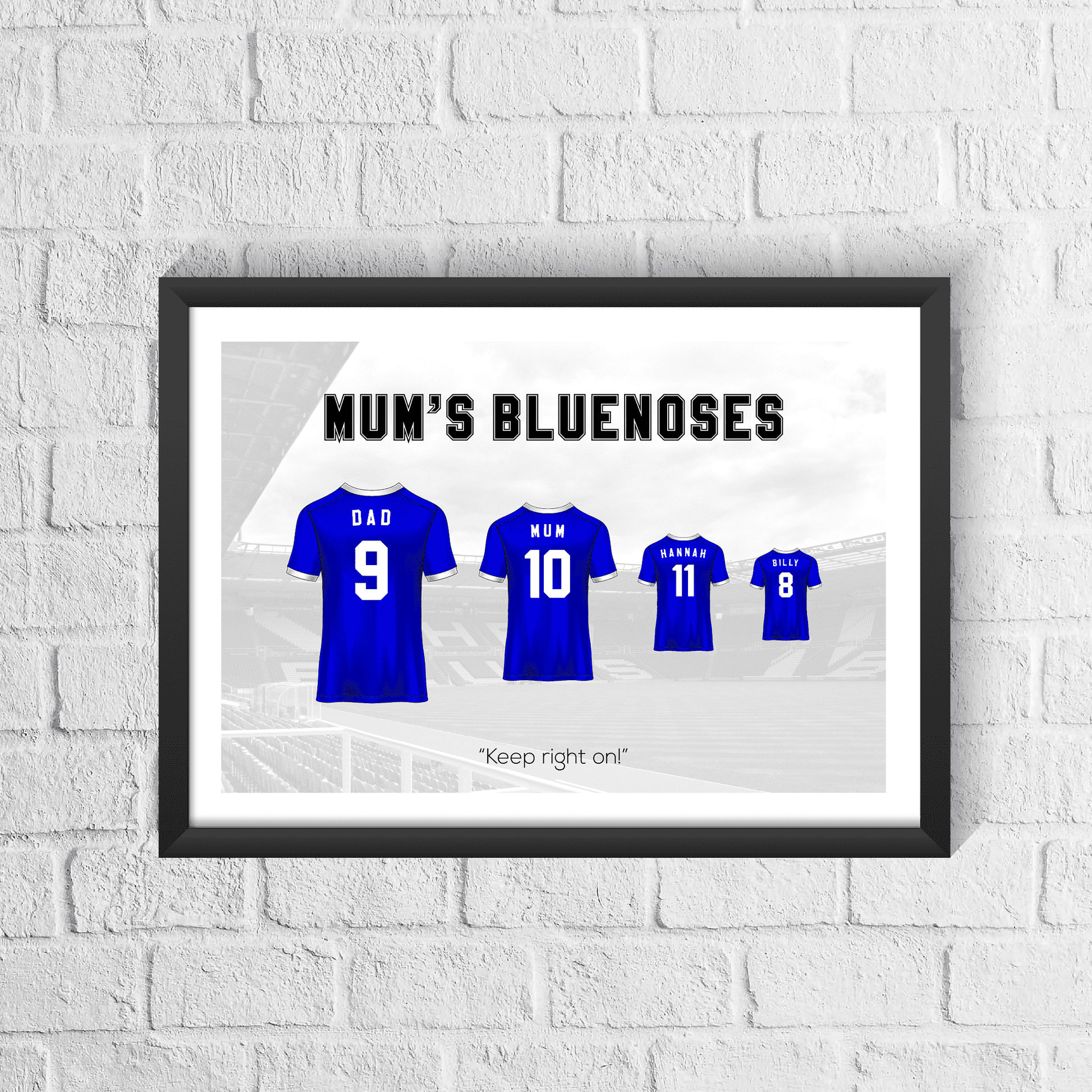 b) Shirt names and numbers i.e. Dad 9, Mum 7, Johnny 12, Sophie 3 (maximum of 6 shirts). Please contact us for more options.
