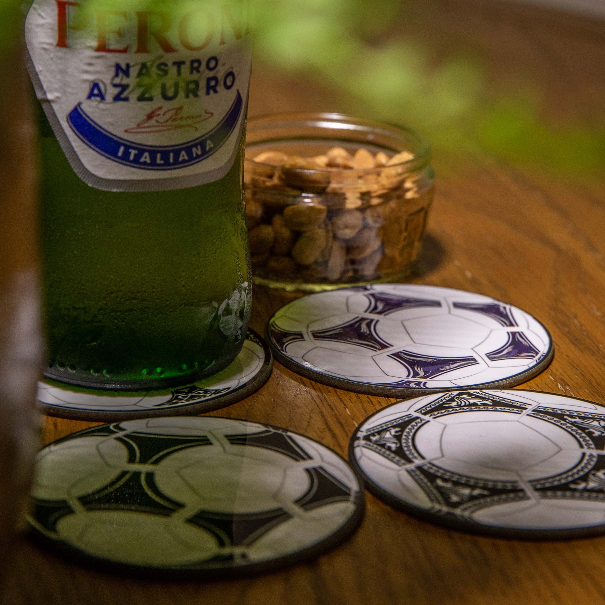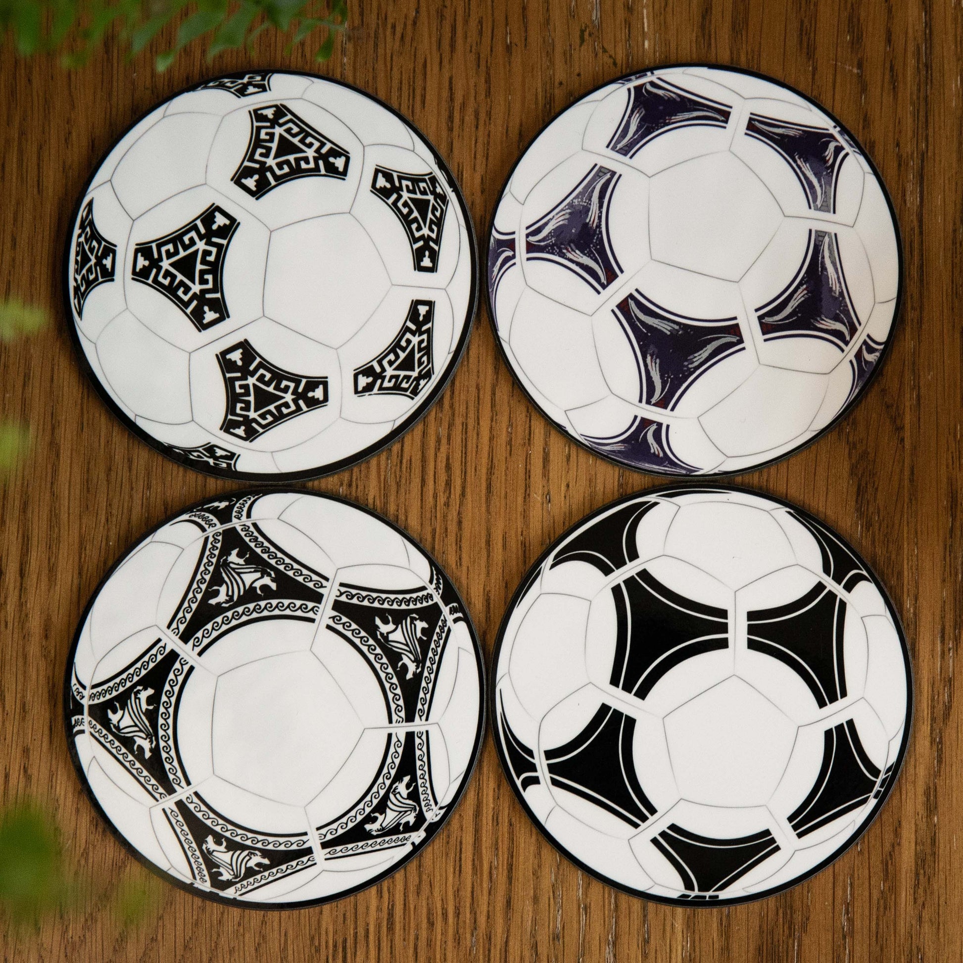 Set of 4 Football World Cup ball coasters. Remember four of the most iconic balls used during the World Cup with this set of high-quality coasters. The perfect gift for any world cup football fan. The set consists of the following four tournament ball designs: