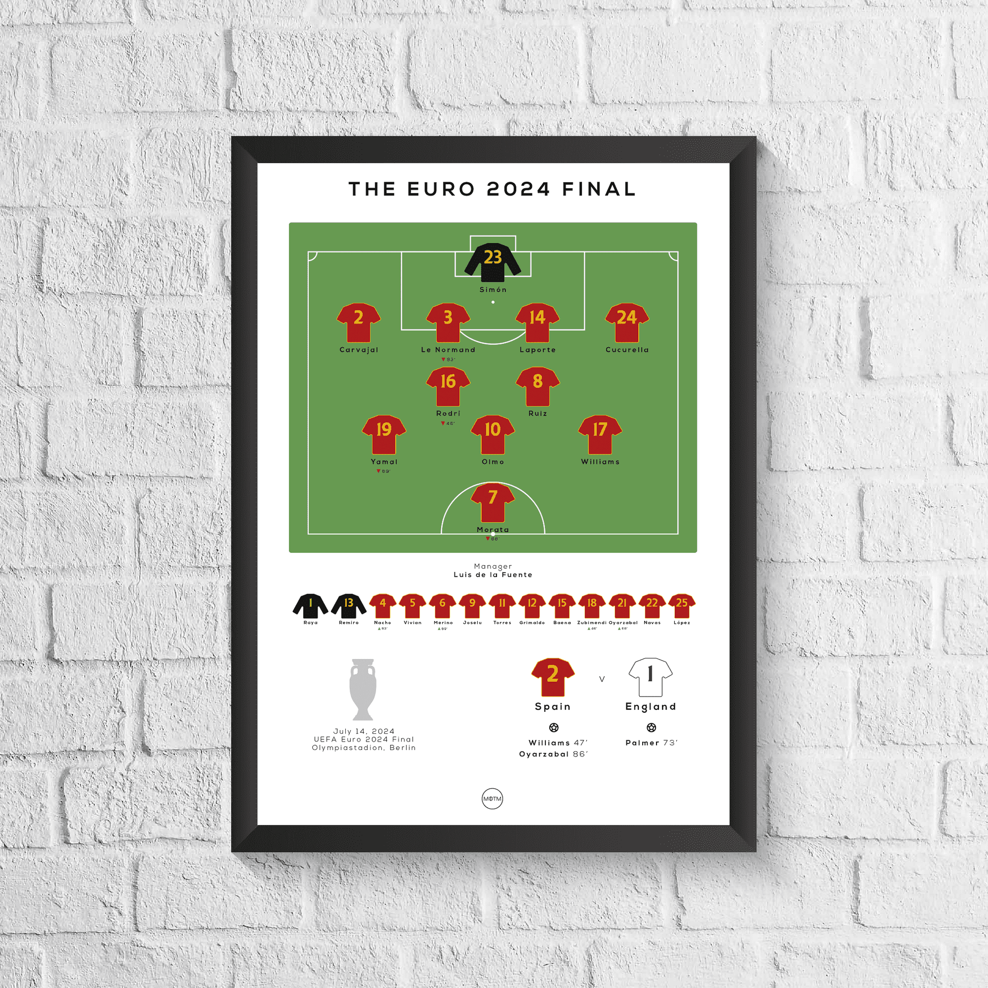 Euro 2024 Final match print. Remember the amazing night that Spain defeated England in Berlin to become European Champions for the fourth time. This high quality print captures the match in diagram form and is the perfect gift for any Spain football fan.